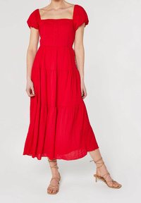 Femme portant une robe midi étagée rouge vif avec des manches bouffantes et un décolleté carré, associée à des sandales à talons beige à lanières.