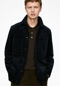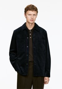 Veste en velours côtelé bleu marine avec un col, deux poches poitrine et fermeture à boutons. Portée sur un polo marron foncé, avec des manches longues.