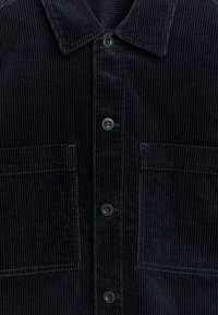 Chemise en velours côtelé bleu marine avec fermeture boutonnée, col et poche poitrine, portée sur un T-shirt blanc, avec des manches longues et une coupe décontractée.