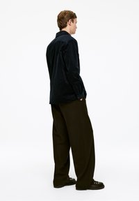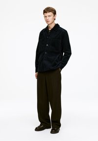 Veste chemise en mélange de laine bleu marine, avec deux poches poitrine, fermeture à boutons et coupe décontractée, portée par-dessus un pull navy et un pantalon noir.