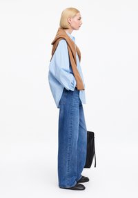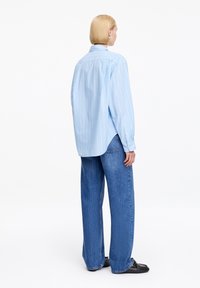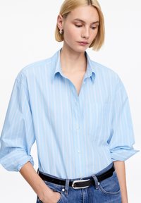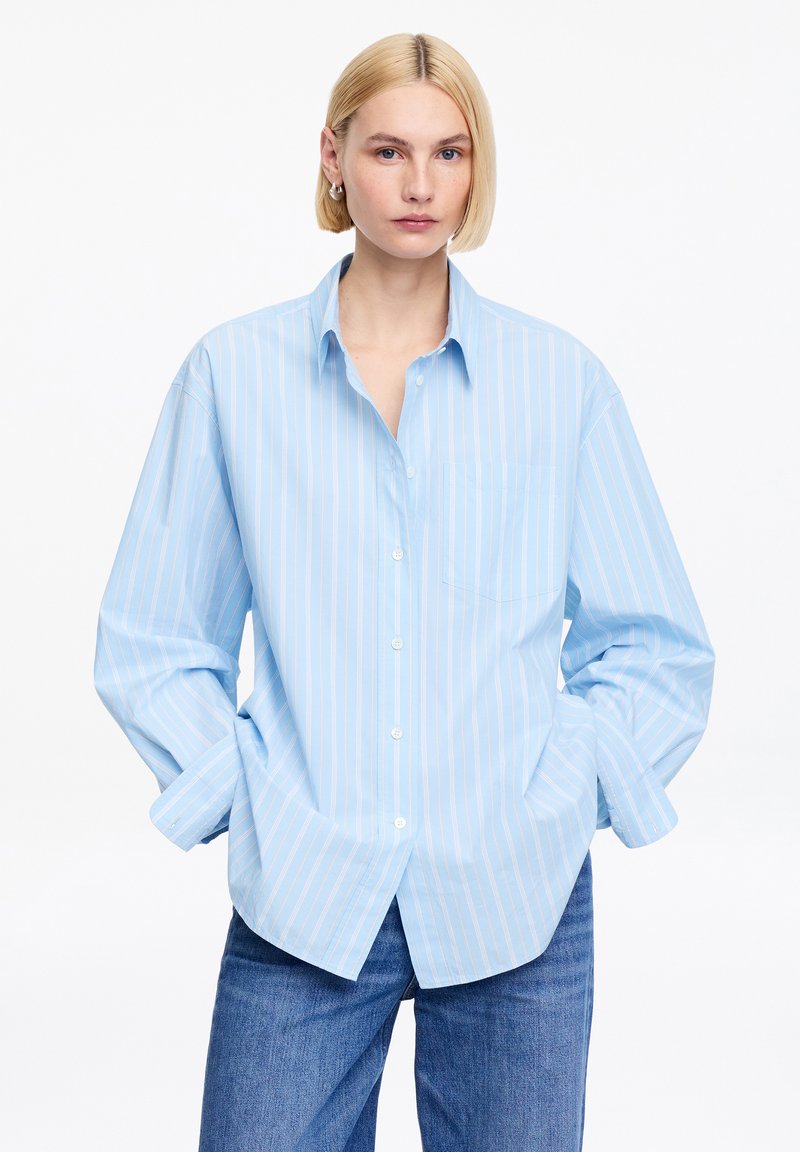 Femme blonde portant une chemise oversize à rayures bleu clair avec les mains dans les poches et un jean bleu, sur fond blanc.