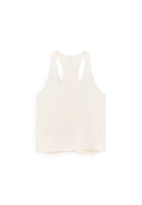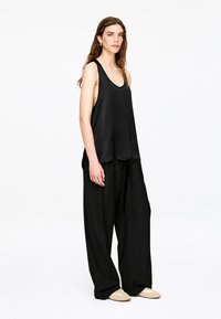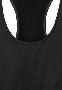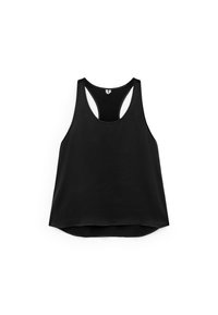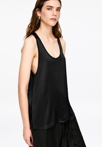 Haut noir sans manches en satin à la texture lisse, doté d'un col arrondi et d'une silhouette ample et fluide.
