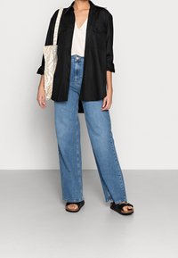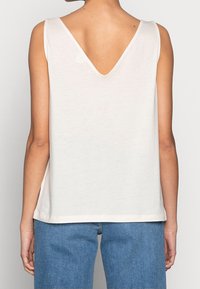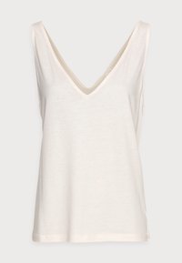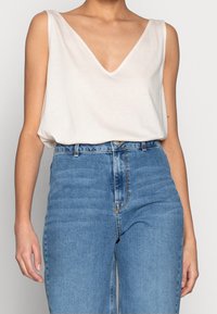 Haut sans manches couleur crème avec un décolleté en V profond, fabriqué à partir d'un tissu doux. Associé à un jean en denim léger bleu clair taille haute.