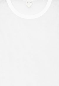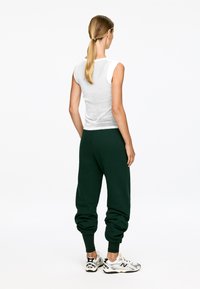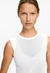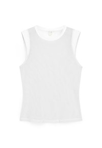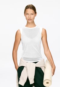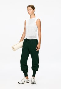 Débardeur en maille blanc sans manches avec encolure ronde, associé à un pantalon vert foncé et à un sweat-shirt beige noué à la taille. Tenir un tapis roulé.