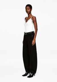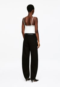 Débardeur blanc avec un col en V et des détails en dentelle le long de l'encolure, associé à un pantalon noir taille haute et une ceinture noire.
