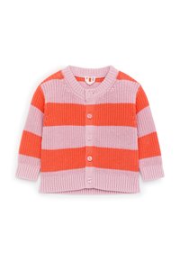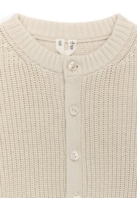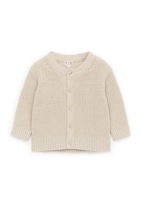 Gilet pour bébé en tricot beige avec manches longues, col rond, boutonnage devant, et bords-côtes aux poignets et à l'ourlet.