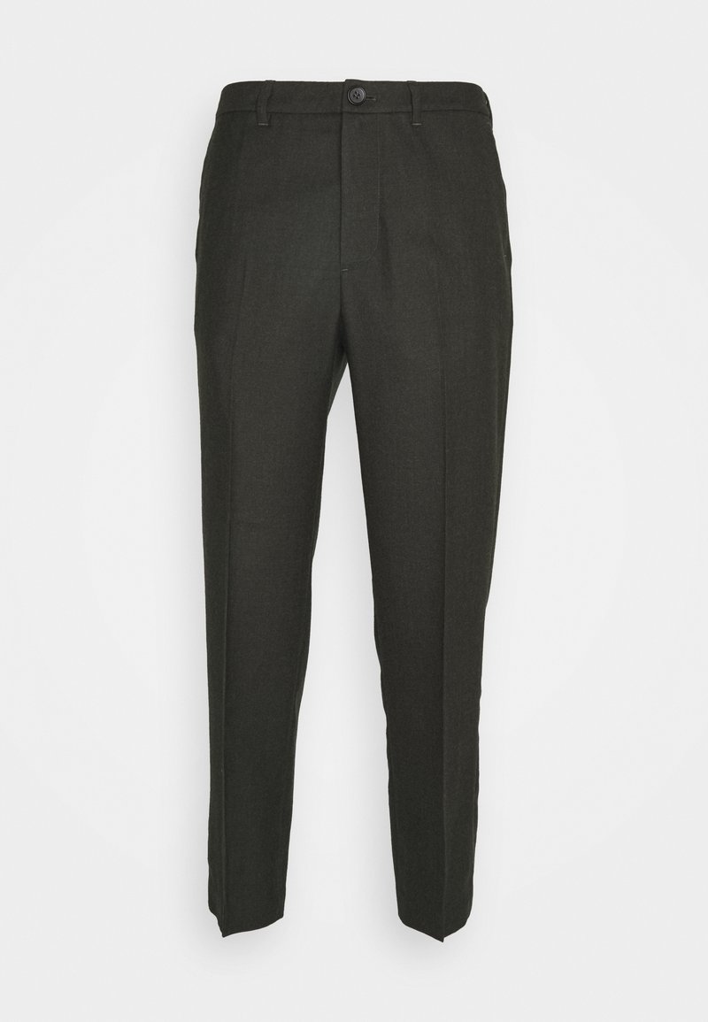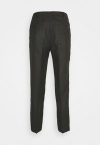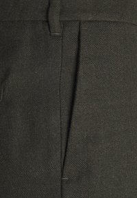 Pantalon sur mesure vert foncé en tissu lisse et texturé. Doté d'une fermeture à boutons à l'avant et de deux poches latérales. Coupe droite.