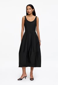 Robe noire sans manches, longueur genoux, avec un corsage ajusté et une jupe évasée. Le mannequin tient un petit sac rond noir et porte des sandales à talons jaunes.