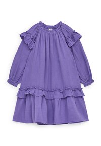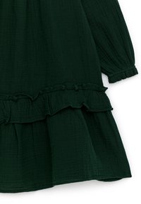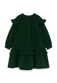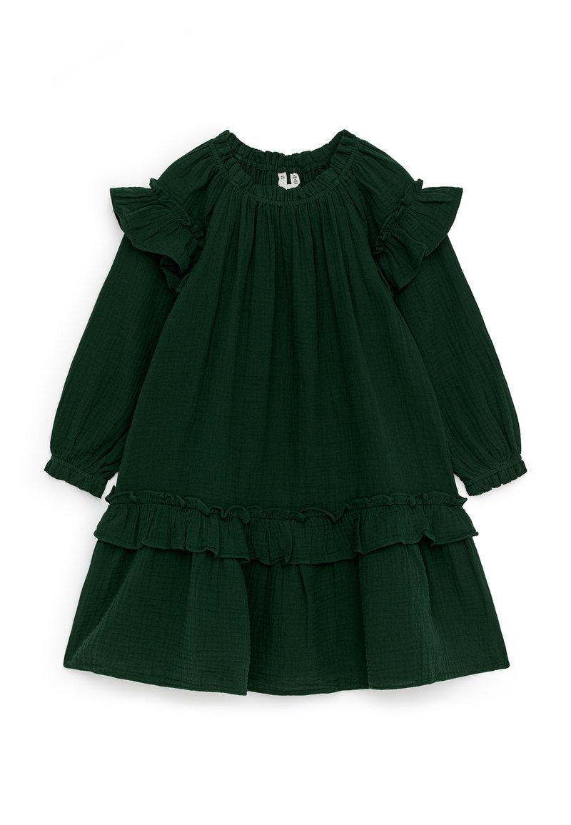 Robe bébé manches longues vert foncé avec détails à volants aux épaules et volants superposés près de l'ourlet, dotée d'un col froncé.