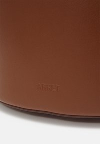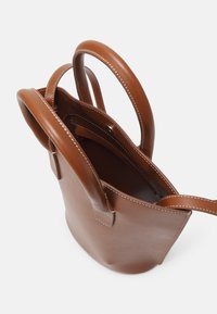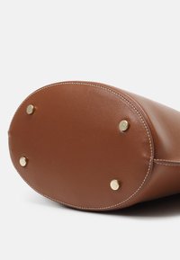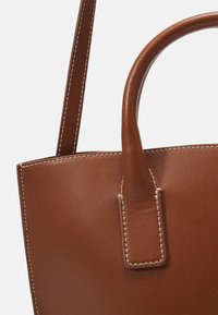 Sac fourre-tout en cuir marron avec deux poignées courtes, bandoulière réglable, couture blanche et forme légèrement trapézoïdale.