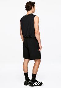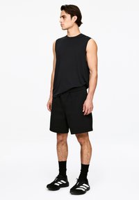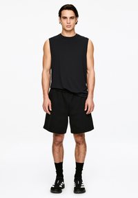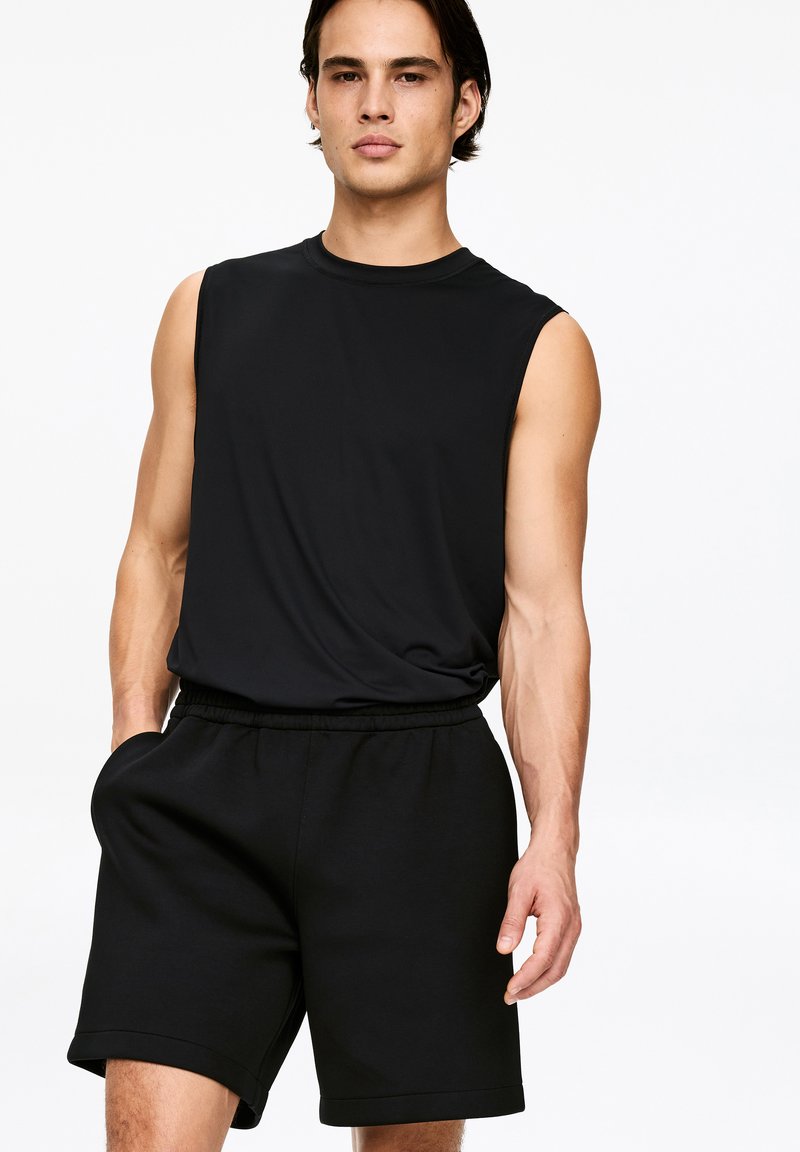 Homme portant un débardeur noir et un short noir, les mains dans les poches, sur un fond blanc uni.