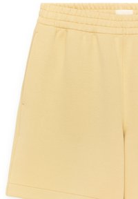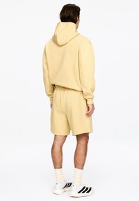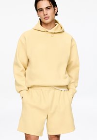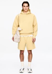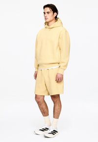 Jeune homme vêtu d'un sweat à capuche jaune et d'un short assorti, debout les mains dans les poches sur un fond uni.