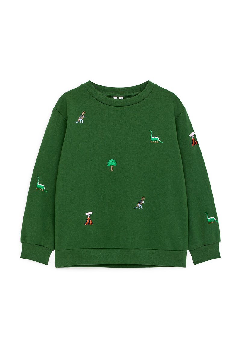 Sweat-shirt vert à manches longues avec des dinosaures, des arbres et des volcans brodés dispersés sur le devant et les manches.