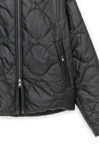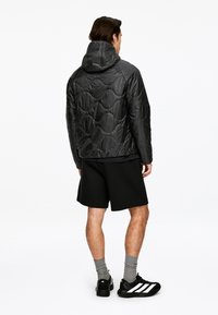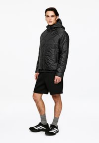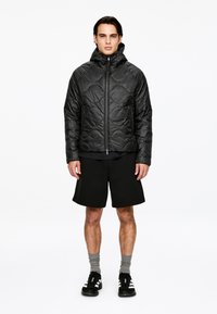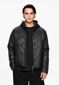 Jeune homme aux cheveux foncés portant une veste matelassée noire à capuche sur une chemise noire, debout devant un fond blanc uni.