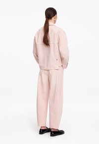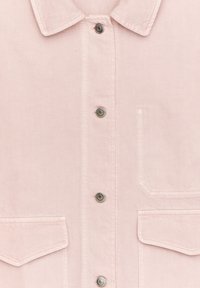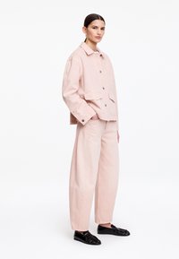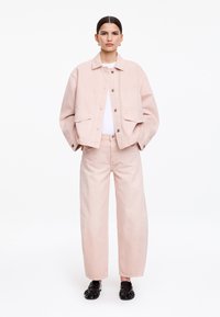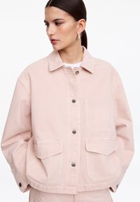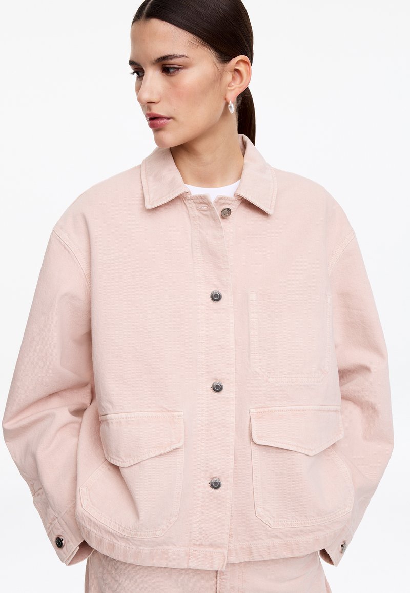 Femme portant une veste ample rose pâle avec fermeture à boutons et poches avant à rabat, regardant vers sa gauche sur un fond blanc.