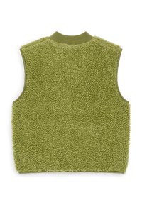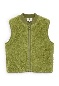 Veste sans manches en polaire vert olive avec fermeture éclair à l'avant et col côtelé, en tissu sherpa texturé.