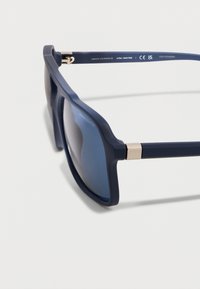 Lunettes de soleil rectangulaires bleues avec des montures épaisses et des verres teintés, posées sur une surface blanche.