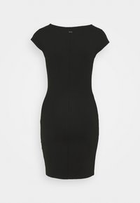 Robe noire cintrée à manches courtes avec encolure dégagée, longueur genou, présentée sur fond blanc uni.