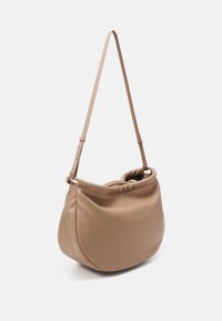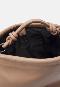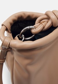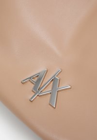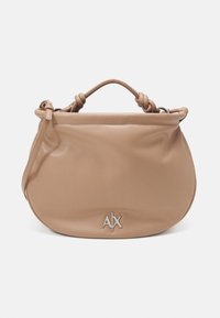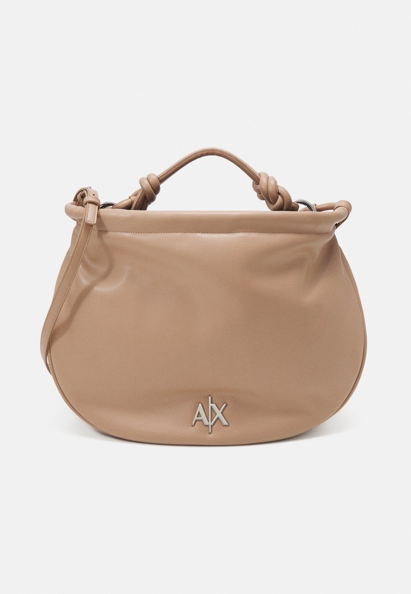 Sac à main en cuir beige avec poignée nouée, bandoulière réglable et logo argenté A|X sur le devant, présenté sur fond blanc uni.
