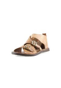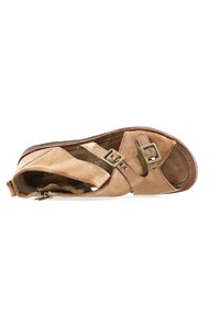 Sandale ouverte en cuir marron avec doubles brides à boucles, talon fermé, et semelle plate basse, présentée sur fond blanc.