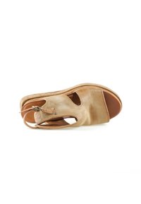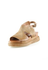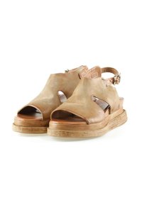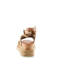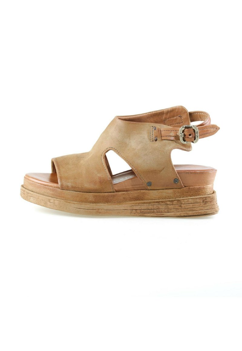 Sandale compensée en suède brun à bout ouvert avec découpes latérales, bride de cheville réglable et semelle texturée sur fond blanc.