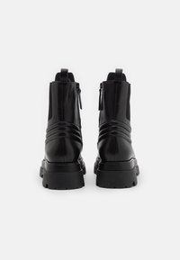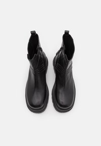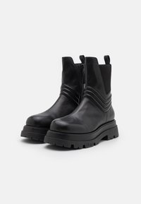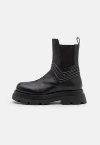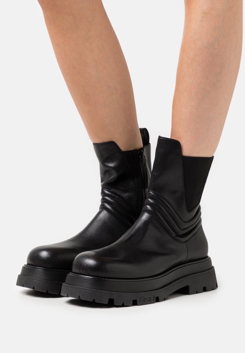 Bottes noires en cuir montantes avec semelles crantées épaisses, fermeture éclair latérale et panneau élastique, portées sur des jambes nues sur fond blanc.