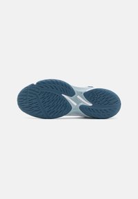 Chaussures de sport blanches avec une tige en mesh, des accents bleus et une semelle texturée. Présentent un bout arrondi et un design de collier confortable.