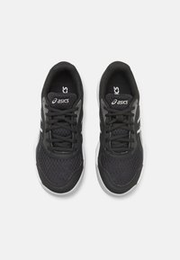 Chaussure de sport noir et blanc avec tige en mesh, semelle blanche et les célèbres rayures d'Asics sur un fond gris uni.