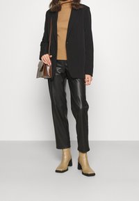 Femme portant un pull à col roulé côtelé camel ajusté et un pantalon en cuir noir, debout contre un fond clair uni.