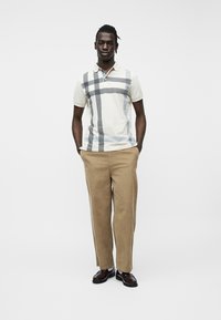 Jeune homme portant un polo beige avec un motif à carreaux noir et gris, et un pantalon en velours côtelé marron clair, debout devant un fond blanc uni.