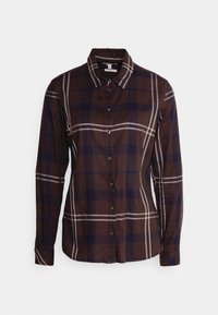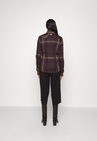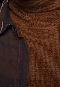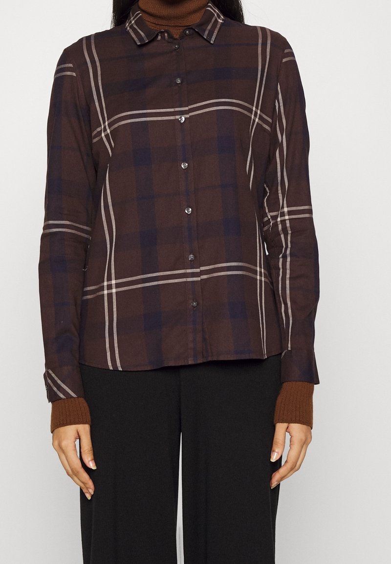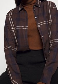 Femme portant une chemise à carreaux marron et bleu marine boutonée par-dessus un pull à col roulé marron et un pantalon noir, debout devant un fond uni.
