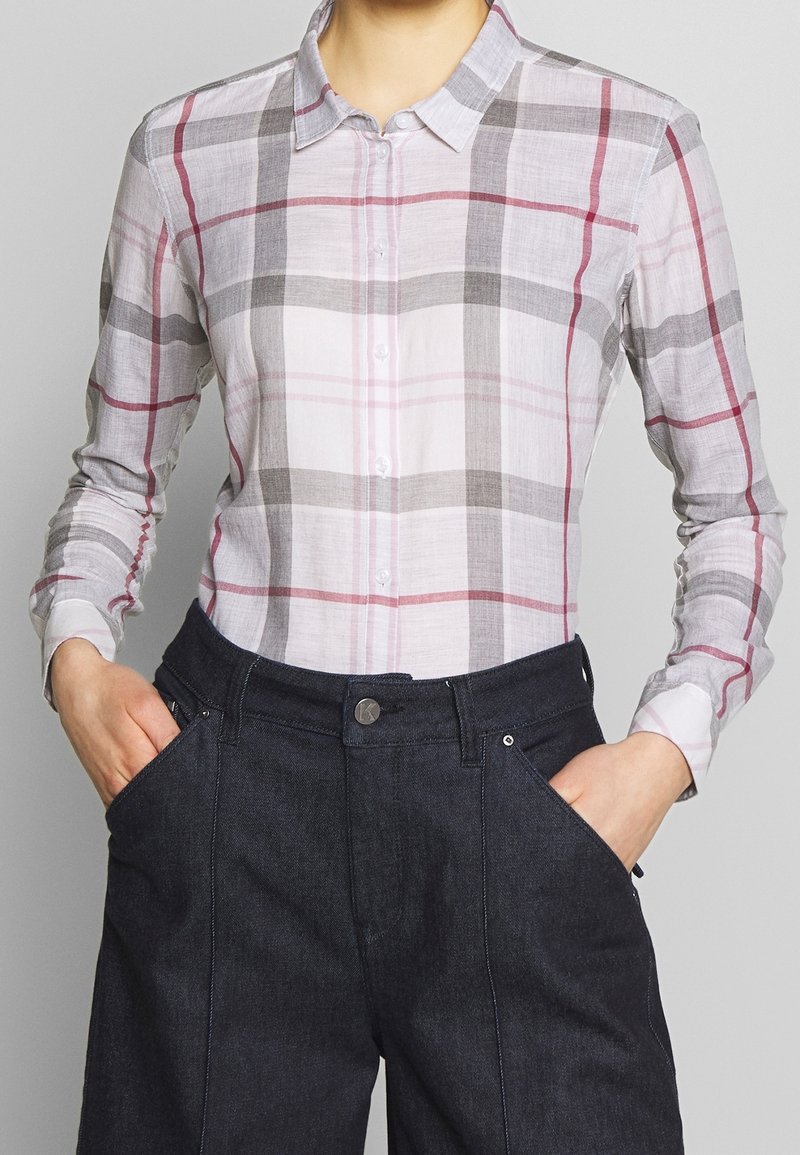 Personne portant une chemise à manches longues à boutons avec un motif à carreaux gris et rouge, rentrée dans un pantalon taille haute foncé, les mains dans les poches.