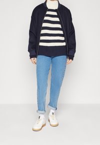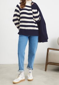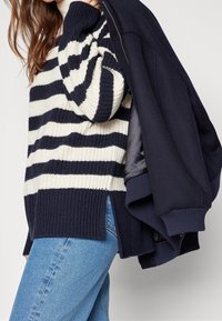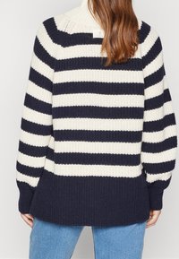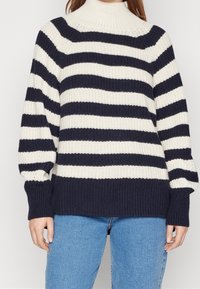 Pull en maille rayé bleu marine et crème avec un col montant, des épaules tombantes et des poignets côtelés. La texture semble épaisse et confortable.