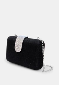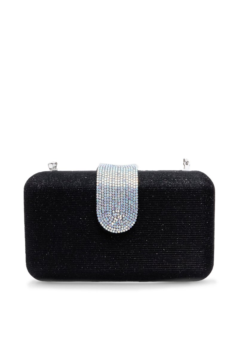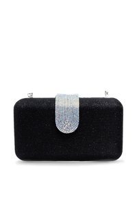 Pochette rectangulaire noire en tissu pailleté avec un fermoir en strass scintillant sur fond blanc.