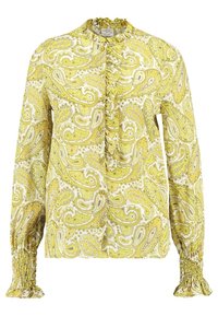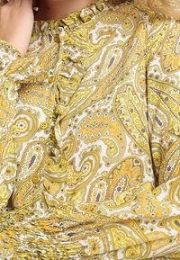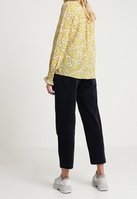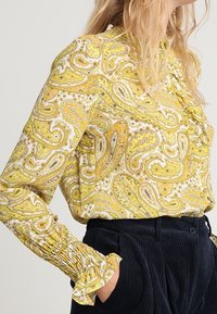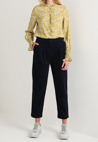 Femme portant un chemisier jaune à motifs cachemire avec volants, rentré dans un pantalon en velours côtelé noir taille haute, les mains dans les poches.