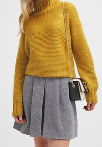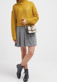 Pull tricoté jaune moutarde avec col montant, épaules tombantes et bords côtelés, associé à une jupe plissée grise.