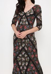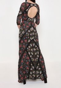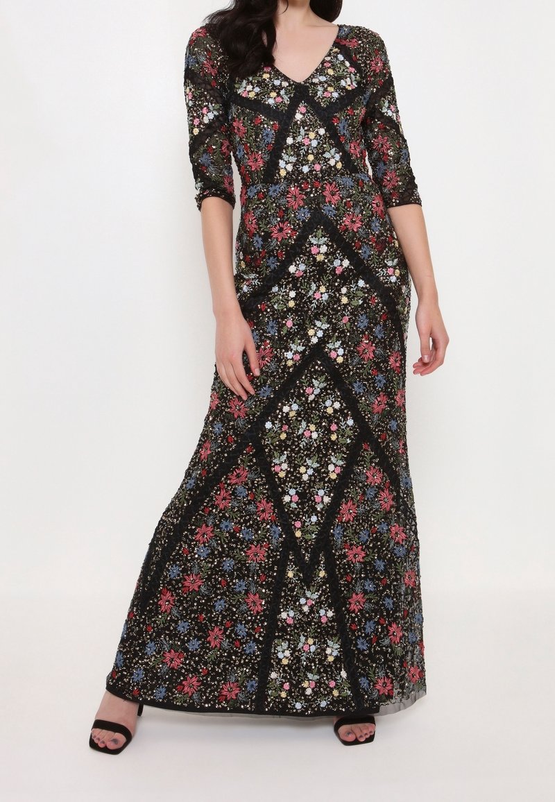Robe longue noire à motif floral avec manches trois-quarts. Présente des motifs floraux colorés et une bordure en dentelle, créant un design géométrique.