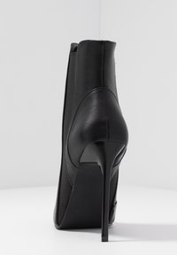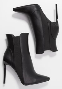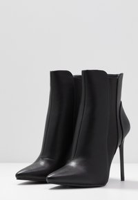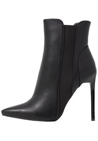 Bottes courtes en cuir noir avec bouts pointus, panneaux latéraux et talons stilettos, associées à un jean bleu cropped.
