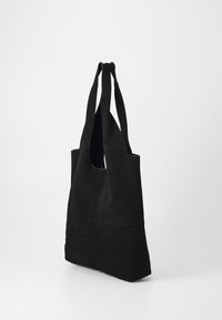 Sac fourre-tout en daim noir avec de larges poignées et une couture verticale apparente au centre, présenté sur un fond clair uni.
