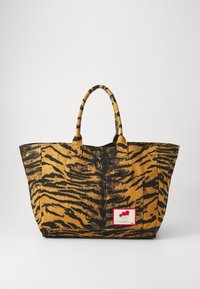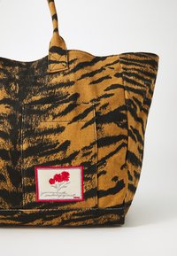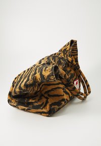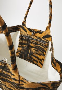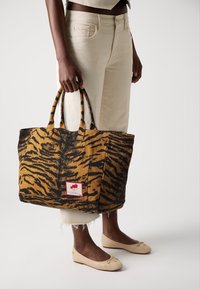Personne portant un pantalon crème et des chaussures plates beiges tenant un grand sac fourre-tout à rayures tigre avec un écusson sur le devant, sur fond blanc.