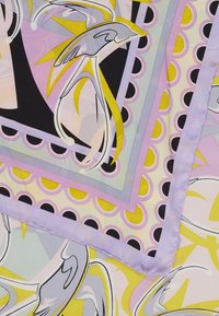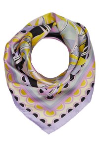 Personne portant un blazer rose vif et une écharpe en soie pastel avec un motif géométrique jaune, noir et rose nouée autour du cou.