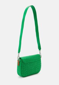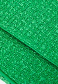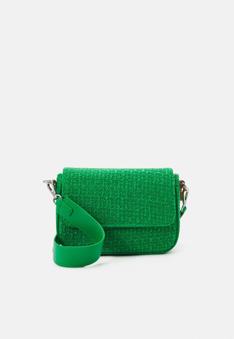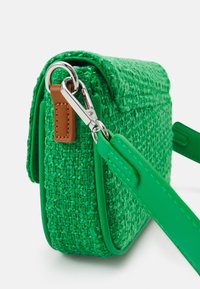 Petit sac bandoulière rectangulaire vert avec texture, doté d'une large sangle et de fermoirs argentés sur un fond neutre.