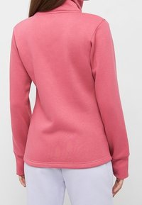 Veste légère rose pâle à fermeture éclair avec un col haut, comportant un logo sur le col et deux poches latérales zippées. Matière douce et lisse, coupe ajustée.