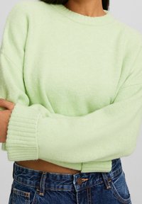 Personne portant un pull ample vert clair avec des poignets côtelés et un jean en denim bleu taille haute, les bras croisés à la taille.