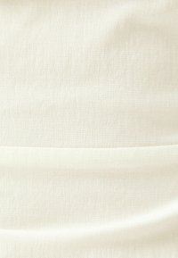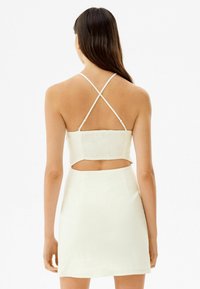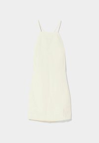 Robe mini de couleur crème avec un col haut et une fente sur le côté. Fabriquée en tissu lisse, elle présente un design ajusté qui met en valeur la silhouette.