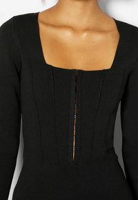 Robe noire ajustée avec décolleté carré, manches longues, coutures verticales et ouverture frontale sécurisée par une quincaillerie texturée.