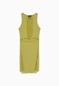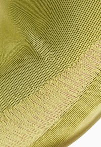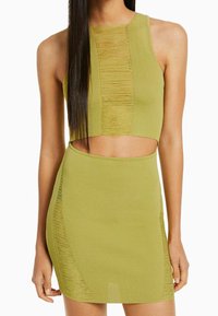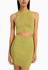 Femme portant un crop top sans manches vert olive et une jupe taille haute assortie avec une texture côtelée et des détails en maille déchirée.