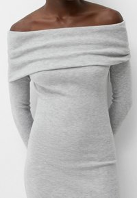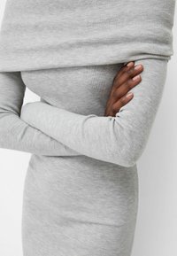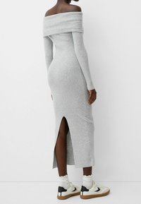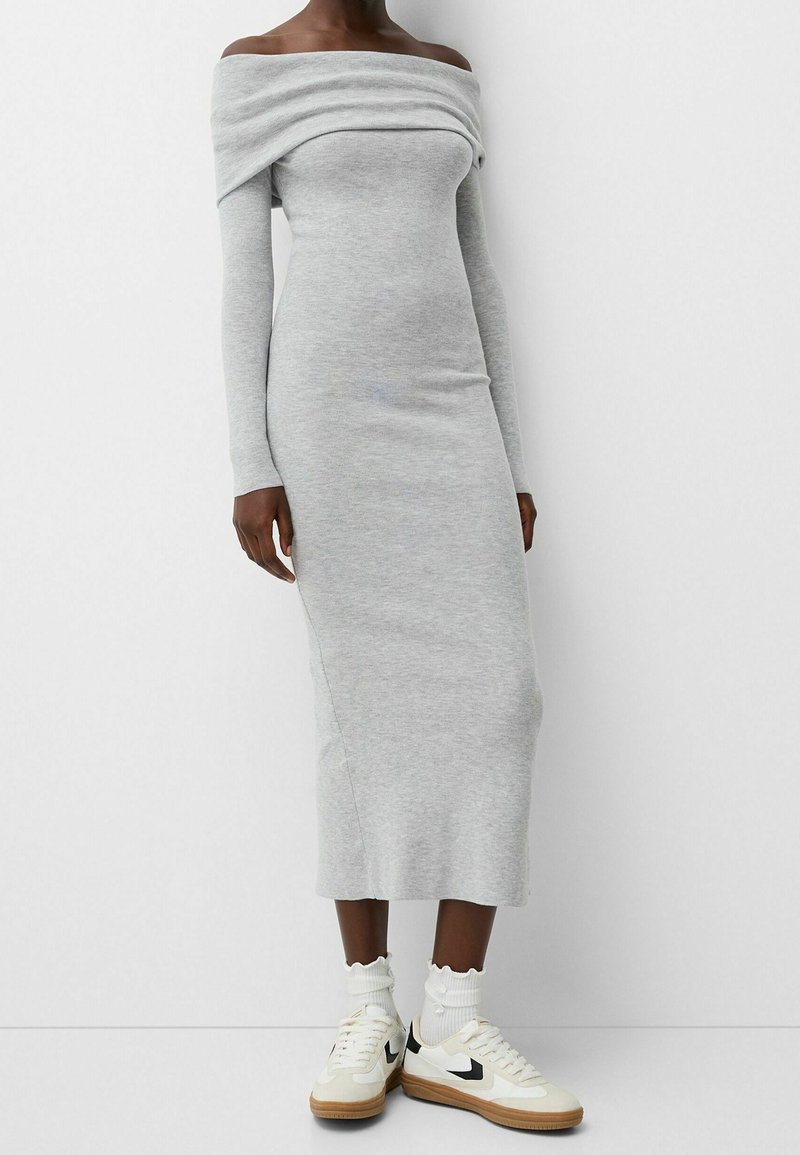 Femme portant une robe midi à manches longues grise clair, épaules dénudées, assortie à des chaussettes blanches et des baskets blanches avec un logo noir.