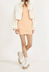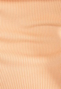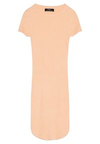 Femme portant une mini-robe près du corps, côtelée, à manches courtes, de couleur pêche clair, debout devant un fond blanc uni.