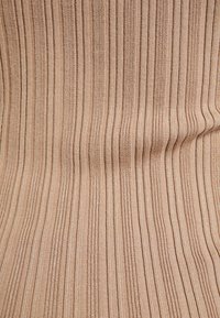 Robe midi en maille côtelée beige, avec une coupe ajustée, des fentes latérales et sans manches, assortie à des bottines noires.